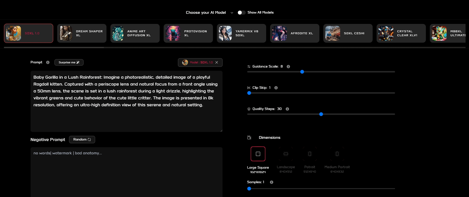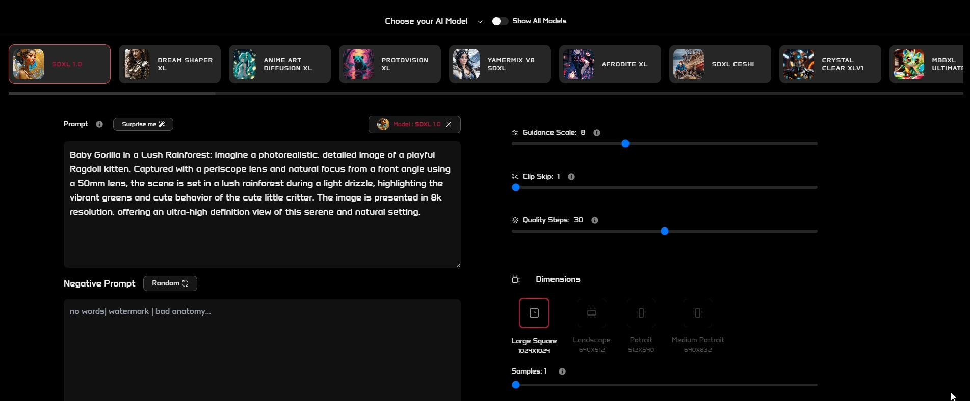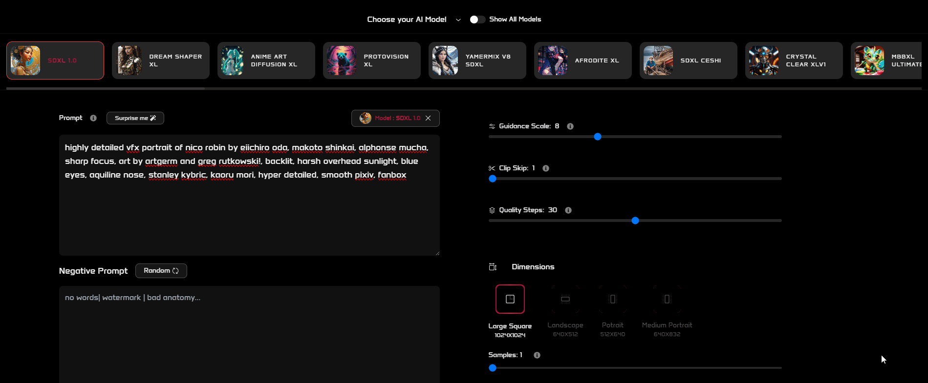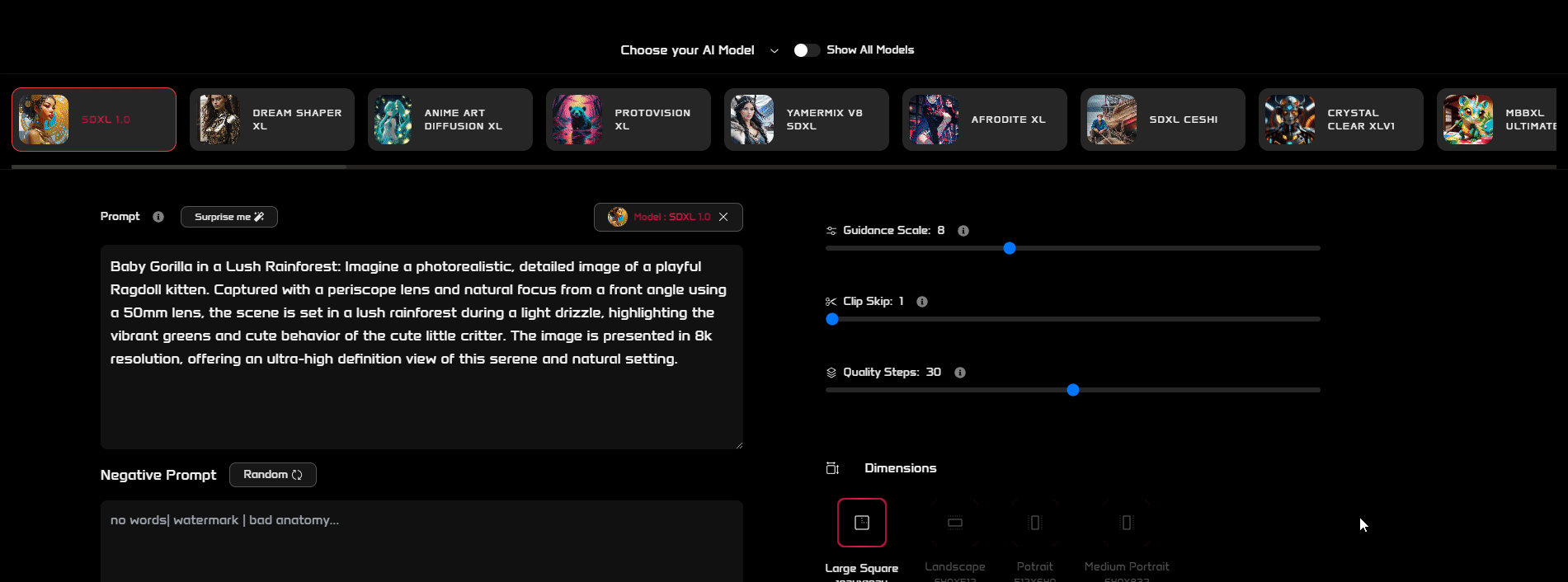 Quality Steps allow you to control the level of detail and refinement in your generated images. A higher number of steps results in images with greater detail and visual fidelity, bringing your creations closer to your vision with each increment. This feature is akin to adding layers of polish to your masterpiece, ensuring that every nuance and subtlety of your original idea is captured with clarity and brilliance.