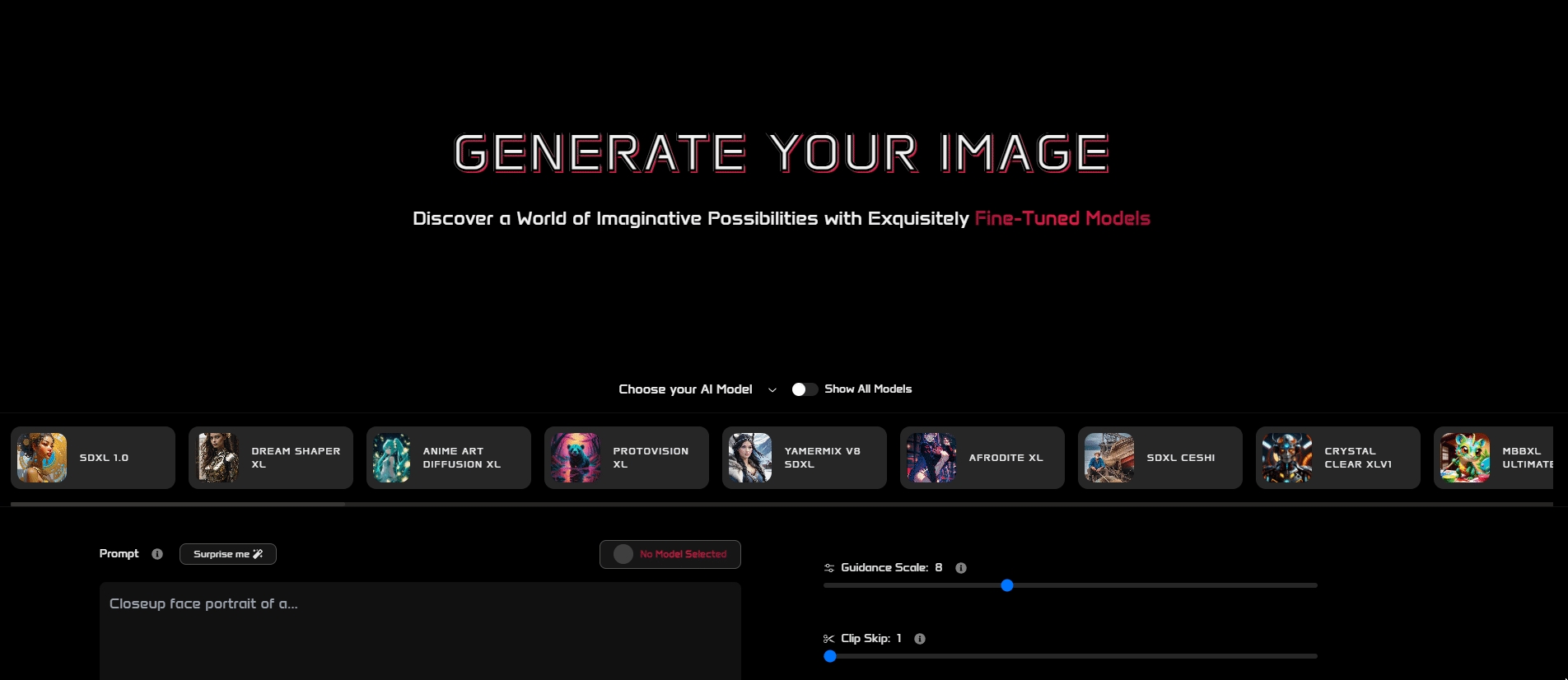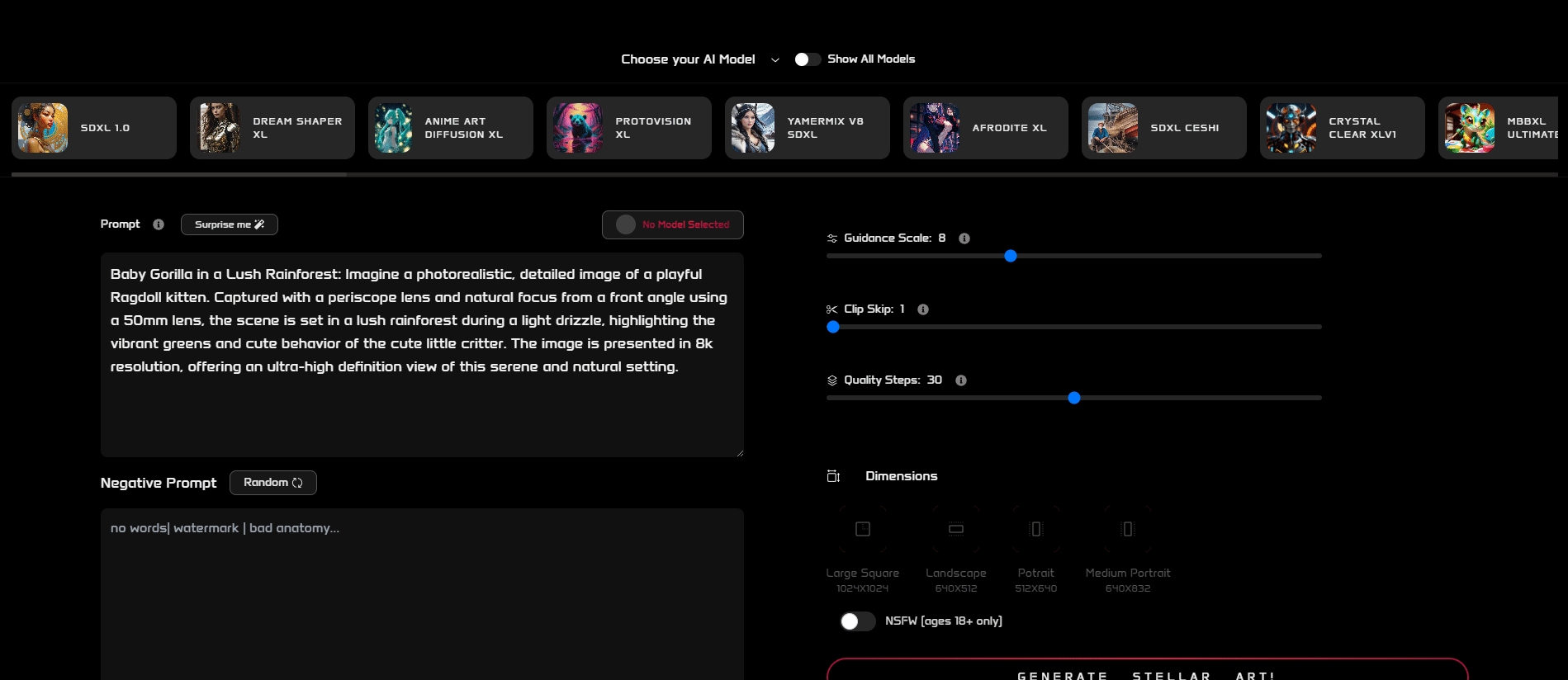 StellaryAI supports over 30 fine-tuned models, each a master of a different domain. From surreal art styles to photorealistic textures, our diverse range of models ensures that no matter your vision, there's a model perfectly suited to bring it to life. Choosing the right model is like selecting the perfect brush or palette for your masterpiece; it defines the essence and character of your creation, making your art truly unique.